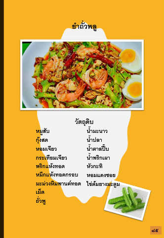 ย าถั่วพลู วัตถุดิบ หมูสับ น ้ามะนาว กุ้งสด น ้าปลา หอมเจียว น ้าตาลปี๊ บ กระเทียมเจียว น ้าพริกเผา พริกแห้งทอด หัวกะทิ หมึกแห้งทอดกรอบ หอมแดงซอย มะม่วงหิมพานต์ทอด ไข่ต้มยางมะตูม เม็ด ถั่วพู ๘๕