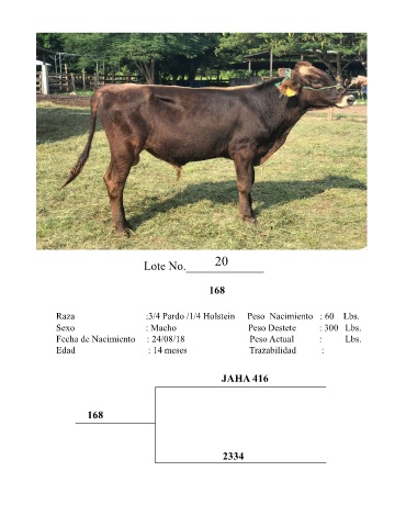 20 Lote No._____________ 168 Raza :3/4 Pardo /1/4 Holstein Peso Nacimiento : 60 Lbs. Sexo : Macho Peso Destete : 300 Lbs. Fecha de Nacimiento : 24/08/18 Peso Actual : Lbs. Edad : 14 meses Trazabilidad : JAHA 416 168 2334