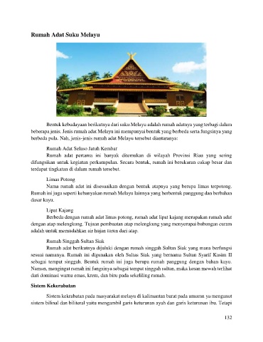 Bentuk kebudayaan berikutnya dari suku Melayu adalah rumah adatnya yang terbagi dalam