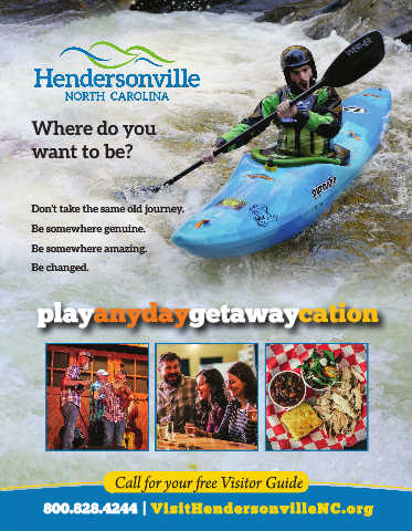 Where do you want to be? Don’t take the same old journey. Be somewhere genuine. Be somewhere amazing. Be changed. playanydaygetawaycation Call for your ee Visitor Guide 800.828.4244 | VisitHendersonvilleNC.org