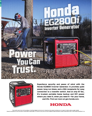Connection of a generator to house power requires a transfer device to avoid possible injury to power company personnel. Consult a qualified electrician. Specifications subject to change without notice. © 2019 American Honda Motor Co., Inc.