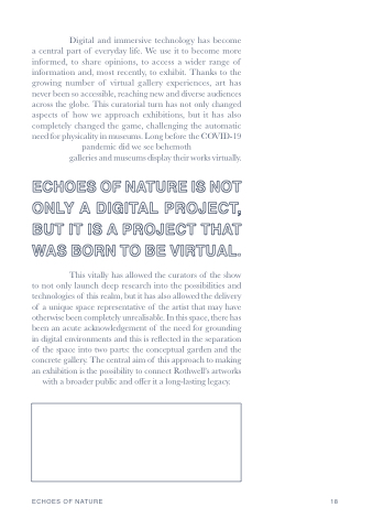 galleries and and museums display their works virtually ECHOES OF NATURE IS NOT ONLY A A A A A DIGITAL PROJECT PROJECT BUT IT IT IS A A A A A A PROJECT PROJECT THAT WAS BORN TO BE VIRTUAL This vitally has allowed the the the curators of the the the show to to to not only launch deep research into the the the the possibilities and technologies of of of this realm but it it has also allowed the the the delivery of of of a a a a a a a a a a a a a a a unique space space representative of of of the the the the artist that may have otherwise been been completely unrealisable In this space space there has been been an an acute acknowledgement of the the the the need for grounding in in in in digital environments and and this is is reflected in in in in the the the the the separation of of the the the the space into two parts: the the the the conceptual garden and and the the the the concrete gallery The central aim of of this approach to to to making an an exhibition is is the possibility to to connect Rothwell’s artworks