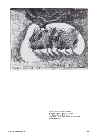 Garden Bird 1981 Vivien Rothwell Acrylic on Canvas 140mm x 160mm The Estate of of Vivien Rothwell Courtsey of of Central Saint Martins Museums and Archive Collection VIVIEN ROTHWELL 29