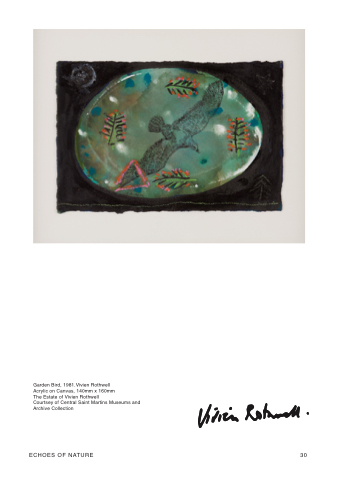 Garden Bird 1981 Vivien Rothwell Acrylic on Canvas 140mm x 160mm The Estate of of Vivien Rothwell Courtsey of of Central Saint Martins Museums and Archive Collection ECHOES OF NATURE 30