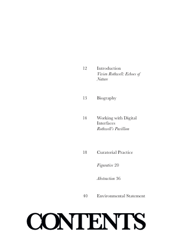 12 Introduction Vivien Rothwell: Echoes of Nature 13 Biography 14 Working with Digital Interfaces Rothwell’s Pavillion 18 Curatorial Practice Figurative 20 Abstraction 36 40 Environmental Statement CONTENTS