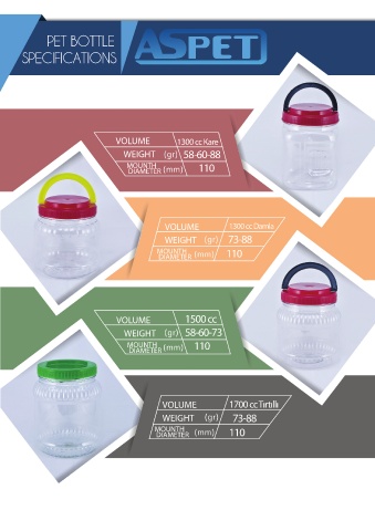 PET BOTTLE SPECIFICATIONS VOLUME 1300 cc Kare WEIGHT 58-60-88 MOUNTH 110 DIAMETER VOLUME 1300 cc Damla WEIGHT 73-88 MOUNTH 110 DIAMETER VOLUME 1500 cc WEIGHT 58-60-73 MOUNTH 110 DIAMETER VOLUME 1700 cc Tırtıllı WEIGHT 73-88 MOUNTH DIAMETER 110