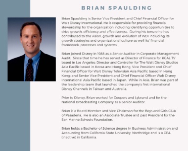 Brian joined Disney in 1988 as a Senior Auditor in Corporate Management