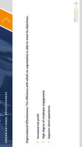O R G AN I Z AT I O N AL E F F E C T I V E N E SS Organizational Effectiveness: The efficiency with which an organization is able to meet its objectives. Increased net profit High degree of employee engagement Superior client experience