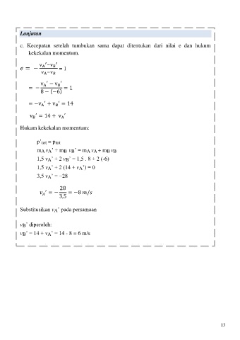 c. Kecepatan setelah tumbukan sama dapat ditentukan dari nilai e dan hukum