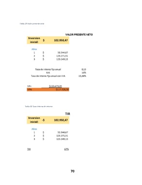 Tabla 29 Valor presente neto Tabla 30 Tasa interna de retorno 70