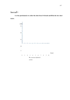 197 กิจกรรมที่ 7 Use the questionnaire to collect the data from 10 friends and fill in the bar chart below. points 25 20 15 10 5 friends 0 1 2 3 4 5 6 7 8 9 10 The conscious of physical exercise