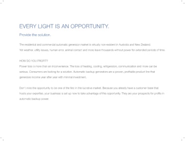 serious. Consumers are looking for a solution. Automatic backup generators are a proven, profitable product line that