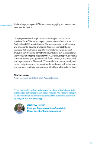 Use progressive web application technology to produce an interface for ADB’s annual report that works on desktops and on Android and iOS smart devices. The web apps are much simpler and cheaper to develop and easier for users to install than a standard iOS or Android app. Proving that innovation doesn’t always mean inventing something new, this project takes existing technology and repurposes it for the ADB annual report, adopting common newspaper app standards for its design, navigation, and reading experience. The result? The reader uses swipe, scroll, and tap to navigate around the smart reader and unlock all its features in a seamless reading experience enriched by multimedia content.