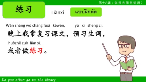 第十六课 :你 常 去 图 书 馆 吗 ? 练习 Liànxí แบบฝึกหัด Wǎn shàng wǒ cháng fùxí kèwén, yù xí sheng cí, 晚上我常复习课文,预习生词, huòzhě zuò liàn xí. 或者做练习。 Do you often go to the library