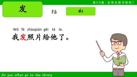 第十六课 :你 常 去 图 书 馆 吗 ? 发 F ā ส่ง Wǒ fā zhàopiàn gěi tā le. 我发照片给他了。 Do you often go to the library