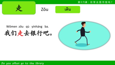 第十六课 :你 常 去 图 书 馆 吗 ? 走 Zǒu เดิน Wǒmen zǒu qù yínháng ba. 我们走去银行吧。 Do you often go to the library