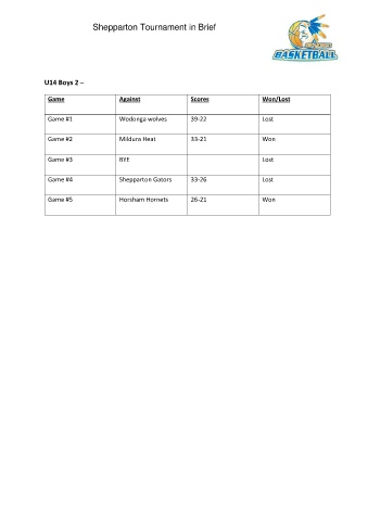 Shepparton Tournament in Brief U14 Boys 2 – Game Against Scores Won/Lost Game #1 Wodonga wolves 39-22 Lost Game #2 Mildura Heat 33-21 Won Game #3 BYE Lost Game #4 Shepparton Gators 33-26 Lost Game #5 Horsham Hornets 26-21 Won
