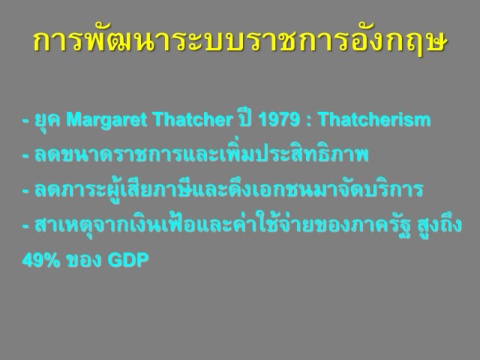 การพัฒนาระบบราชการอังกฤษ - ยุค Margaret Thatcher ปี 1979 : Thatcherism - ลดขนาดราชการและเพิ่มประสิทธิภาพ - ลดภาระผู้เสียภาษีและดึงเอกชนมาจัดบริการ - สาเหตุจากเงินเฟ้ อและค่าใช้จ่ายของภาครัฐ สูงถึง 49% ของ GDP