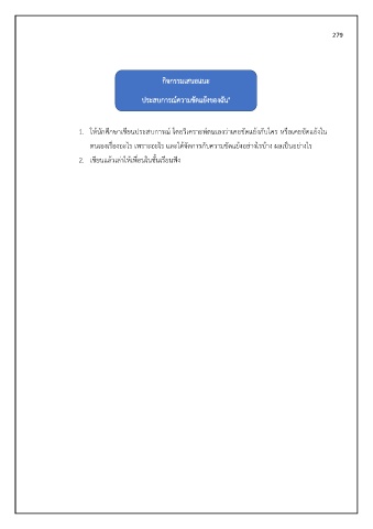 279 กิจกรรมเสนอแนะ ประสบการณ์ความขัดแย้งของฉัน" 1. ให้นักศึกษาเขียนประสบการณ์ โดยวิเคราะห์ตนเองว่าเคยขัดแย้งกับใคร หรือเคยขัดแย้งใน ตนเองเรื่องอะไร เพราะอะไร และได้จัดการกับความขัดแย้งอย่างไรบ้าง ผลเป็นอย่างไร 2. เขียนแล้วเล่าให้เพื่อนในชั้นเรียนฟัง