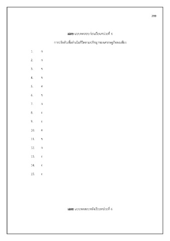 299 เฉลย แบบทดสอบก่อนเรียนหน่วยที่ 6 การปรับตัวเพื่อด าเนินชีวิตตามปรัชญาของเศรรษฐกิจพอเพียง 1. ก 2. ก 3. ข 4. ข 5. ค 6. ข 7. ก 8. ง 9. ง 10. ค 11. ข 12. ก 13. ง 14. ง 15. ง เฉลย แบบทดสอบหลังเรียนหน่วยที่ 6