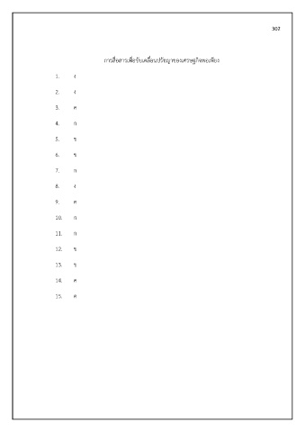 302 การสื่อสารเพื่อขับเคลื่อนปรัชญาของเศรษฐกิจพอเพียง 1. ง 2. ง 3. ค 4. ก 5. ข 6. ข 7. ก 8. ง 9. ค 10. ก 11. ก 12. ข 13. ข 14. ค 15. ค