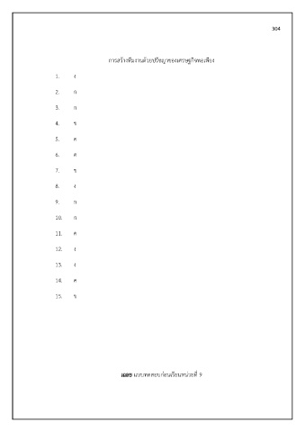 304 การสร้างทีมงานด้วยปรัชญาของเศรษฐกิจพอเพียง 1. ง 2. ก 3. ก 4. ข 5. ค 6. ค 7. ข 8. ง 9. ก 10. ก 11. ค 12. ง 13. ง 14. ค 15. ข เฉลย แบบทดสอบก่อนเรียนหน่วยที่ 9