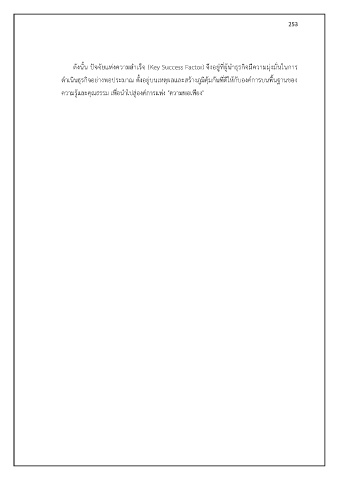 253 ดังนั้น ปัจจัยแห่งความส าเร็จ (Key Success Factor) จึงอยู่ที่ผู้น าธุรกิจมีความมุ่งมั่นในการ ด าเนินธุรกิจอย่างพอประมาณ ตั้งอยู่บนเหตุผลและสร้างภูมิคุ้มกันที่ดีให้กับองค์การบนพื้นฐานของ ความรู้และคุณธรรม เพื่อน าไปสู่องค์การแห่ง "ความพอเพียง"