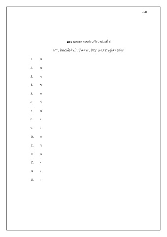 300 เฉลย แบบทดสอบก่อนเรียนหน่วยที่ 6 การปรับตัวเพื่อด าเนินชีวิตตามปรัชญาของเศรรษฐกิจพอเพียง 1. ก 2. ก 3. ข 4. ข 5. ค 6. ข 7. ก 8. ง 9. ง 10. ค 11. ข 12. ก 13. ง 14. ง 15. ง
