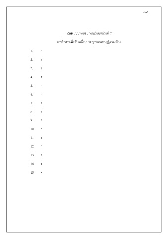 302 เฉลย แบบทดสอบก่อนเรียนหน่วยที่ 7 การสื่อสารเพื่อขับเคลื่อนปรัชญาของเศรษฐกิำจพอเพียง 1. ค 2. ข 3. ข 4. ง 5. ก 6. ก 7. ง 8. ข 9. ค 10. ค 11. ง 12. ก 13. ข 14. ง 15. ค