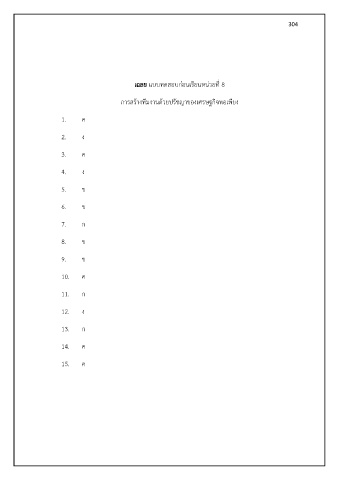 304 เฉลย แบบทดสอบก่อนเรียนหน่วยที่ 8 การสร้างทีมงานด้วยปรัชญาของเศรษฐกิจพอเพียง 1. ค 2. ง 3. ค 4. ง 5. ข 6. ข 7. ก 8. ข 9. ข 10. ค 11. ก 12. ง 13. ก 14. ค 15. ค