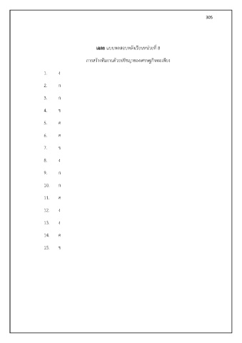 305 เฉลย แบบทดสอบหลังเรียนหน่วยที่ 8 การสร้างทีมงานด้วยปรัชญาของเศรษฐกิจพอเพียง 1. ง 2. ก 3. ก 4. ข 5. ค 6. ค 7. ข 8. ง 9. ก 10. ก 11. ค 12. ง 13. ง 14. ค 15. ข