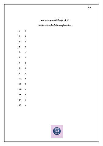 309 เฉลย แบบทดสอบหลังเรียนหน่วยที่ 10 การบริหารความขัดแย้งด้วยเศรษฐกิจพอเพียง 1. ง 2. ค 3. ก 4. ก 5. ข 6. ข 7. ค 8. ง 9. ง 10. ค 11. ก 12. ข 13. ก 14. ง 15. ค