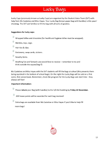 help from Ms Castelow and Miss Hayes. Your Lucky Bag (brown paper bag with handles) is this years’
