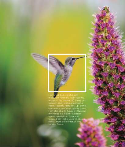 I am small but colorful with iridescent feathers. I can flap my wings so fast (about 80 times per second) and I make a humming noise. I can fly right, left, up, down, backwards, and even upside down . I am also able to hover by flapping my wings in a figure-8 pattern. I have a specialized long and tapered bill that is used to obtain nectar from the center of long, tubular flower.