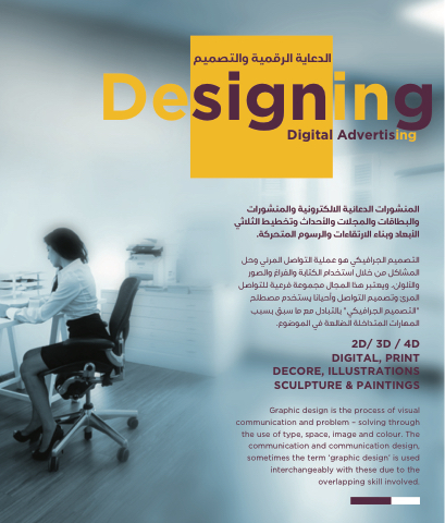 المنشورات الدعائية الالكترونية والمنشورات والبطاقات والمجلات والأحداث وتخطيط الثلاثي الأبعاد وبناء الارتقاءات والرسوم المتحركة.