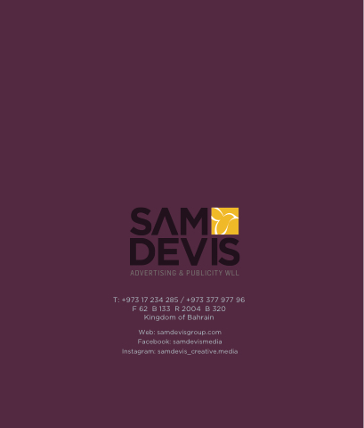 T: +973 17 234 285 / +973 377 977 96 F 62 B 133 R 2004 B 320 Kingdom of Bahrain Web: samdevisgroup.com Facebook: samdevismedia Instagram: samdevis_creative.media