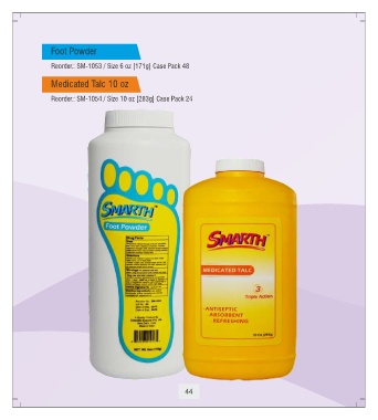 Foot Powder Reorder.: SM-1053 / Size 6 oz [171g] Case Pack 48 Medicated Talc 10 oz Reorder.: SM-1054 / Size 10 oz [283g] Case Pack 24 44