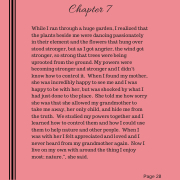 While I ran through a huge garden, I realized that the plants beside me were dancing passionately in their element and the flowers that hung over stood stronger, but as I got angrier, the wind got stronger, so strong that trees were being uprooted from the ground. My powers were becoming stronger and stronger and I didn’t know how to control it. When I found my mother, she was incredibly happy to see me and I was happy to be with her, but was shocked by what I had just done to the place. She told me how sorry she was that she allowed my grandmother to take me away, her only child, and hide me from the truth. We studied my powers together and I learned how to control them and how I could use them to help nature and other people. When I was with her I felt appreciated and loved and I never heard from my grandmother again. Now I live on my own with around the thing I enjoy most; nature.”, she said.