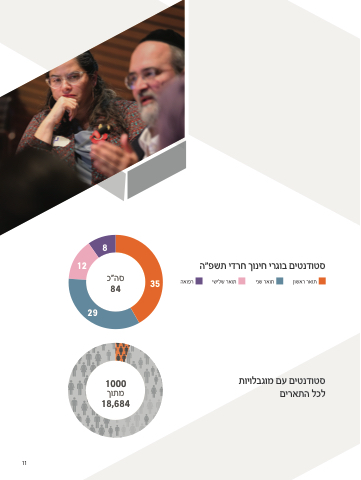 12 סטודנטים בוגרי חינוך חרדי תשפ״ה 8 סה״כ 84 35 29 רפואה תואר שלישי תואר ראשון תואר שני 11 1000 מתוך 18,684 סטודנטים עם מוגבלויות לכל התארים