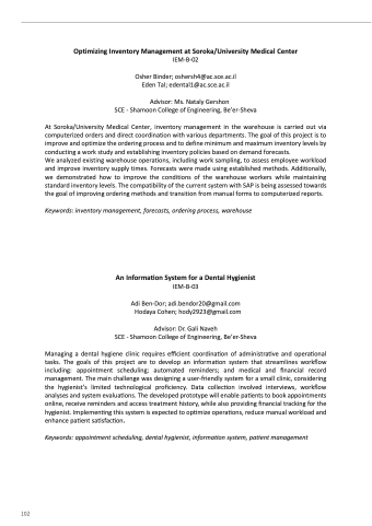 At Soroka/University Medical Center, inventory management in the warehouse is carried out via computerized orders and direct coordination with various departments. The goal of this project is to improve and optimize the ordering process and to define minimum and maximum inventory levels by conducting a work study and establishing inventory policies based on demand forecasts.