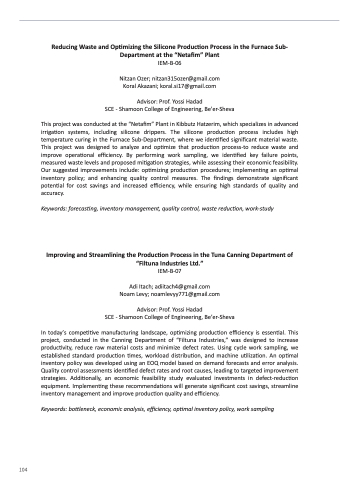This project was conducted at the “Netafim” Plant in Kibbutz Hatzerim, which specializes in advanced irrigation systems, including silicone drippers. The silicone production process includes high temperature curing in the Furnace Sub-Department, where we identified significant material waste. This project was designed to analyze and optimize that production process-to reduce waste and improve operational efficiency. By performing work sampling, we identified key failure points, measured waste levels and proposed mitigation strategies, while assessing their economic feasibility. Our suggested improvements include: optimizing production procedures; implementing an optimal inventory policy; and enhancing quality control measures. The findings demonstrate significant potential for cost savings and increased efficiency, while ensuring high standards of quality and accuracy.