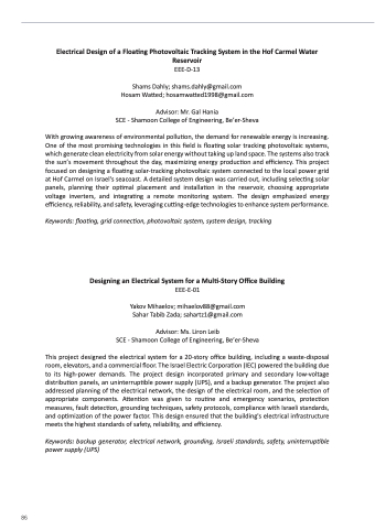 With growing awareness of environmental pollution, the demand for renewable energy is increasing. One of the most promising technologies in this field is floating solar tracking photovoltaic systems, which generate clean electricity from solar energy without taking up land space. The systems also track the sun’s movement throughout the day, maximizing energy production and efficiency. This project focused on designing a floating solar-tracking photovoltaic system connected to the local power grid at Hof Carmel on Israel's seacoast. A detailed system design was carried out, including selecting solar panels, planning their optimal placement and installation in the reservoir, choosing appropriate voltage inverters, and integrating a remote monitoring system. The design emphasized energy efficiency, reliability, and safety, leveraging cutting-edge technologies to enhance system performance.