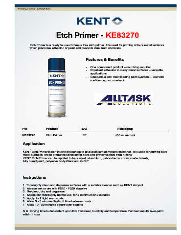 KENT Etch Primer is rich in zinc phosphate to give excellent corrosion resistance. It is used for priming bare