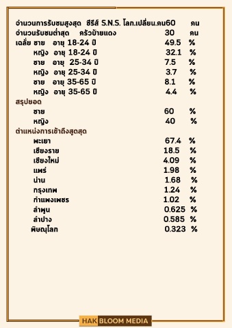 จำนวนการรับชมสูงสุด ซีรีส S.N.S. โลก.เปลี่ยน.คน60 คน