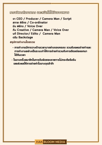 - การทำงานมีการวางดานเวลามาอยางรอบครอบ รวมถึงแผนถายทำและ