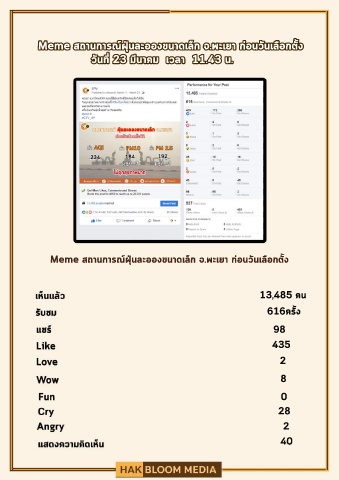 Meme สถานการณฝุนละอองขนาดเล็ก จ.พะเยา กอนวันเลือกตั้ง วันที่ 23 มีนาคม เวลา 11.43 น. Meme สถานการณฝุนละอองขนาดเล็ก จ.พะเยา กอนวันเลือกตั้ง 13,485 คน 616ครั้ง 98 435 2 8 0 28 2 40