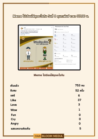 Meme ไปเรียนใสชุดอะไรกัน วันที่ 8 กุมภาพันธ เวลา 07.00 น. Meme ไปเรียนใสชุดอะไรกัน 753 คน 52 ครั้ง 6 37 3 1 0 0 0 5