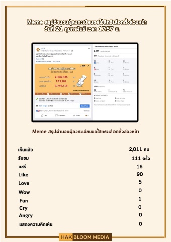 Meme สรุปจำนวนผูลงทะเบียนขอใชสิทธิเลือกตั้งลวงหนา วันที่ 21 กุมภาพันธ เวลา 17.57 น. Meme สรุปจำนวนผูลงทะเบียนขอใ้สิทธะเลือกตั้งลวงหนา 2,011 คน 111 ครั้ง 16 90 5 0 1 0 0 0