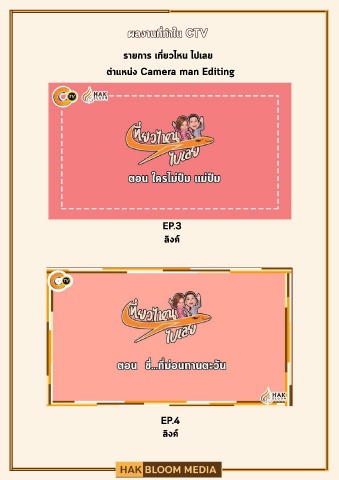 ผลงานที่ทำใน CTV รายการ เที่ยวไหน ไปเลย ตำแหนง Camera man Editing EP.3 ลิงค EP.4 ลิงค