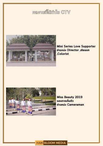 ผลงานที่ไดทำใน CTV Mini Series Love Supporter ตำแหนง Director ,เขียนบท ,Colorist Miss Beauty 2019 รอบการเก็บตัว ตำแหนง Cameraman